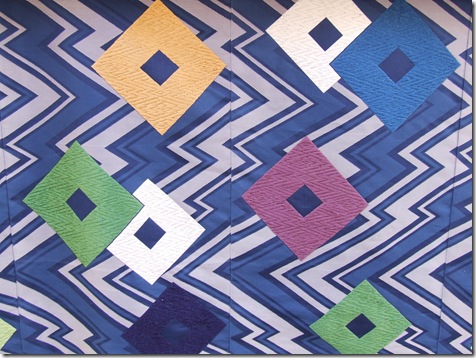 ジグザグと縦に描かれた模様が稲妻を表している。落ち着いた青い色を基調とし、ところどころにオレンジや緑や紫などの鮮やかな四角い模様(釘抜文様)が散りばめられている。