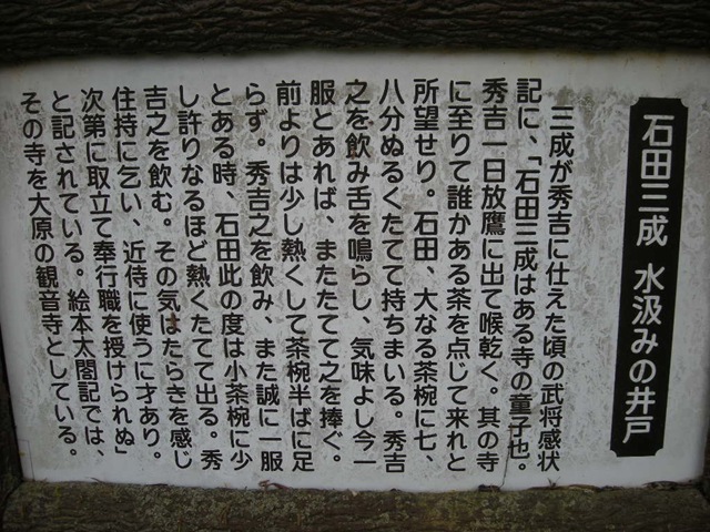 三成が秀吉に献上したお茶を点てるために水を汲んだという井戸です。今もちゃんと残ってる、ということは、このお話は本当だったということなのでしょう。