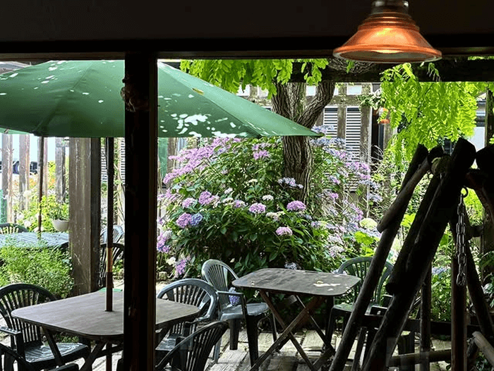 木の温もりある空間が心地よいカフェレストラン。わんちゃん連れOKなテラス席はイングリッシュガーデン風です。